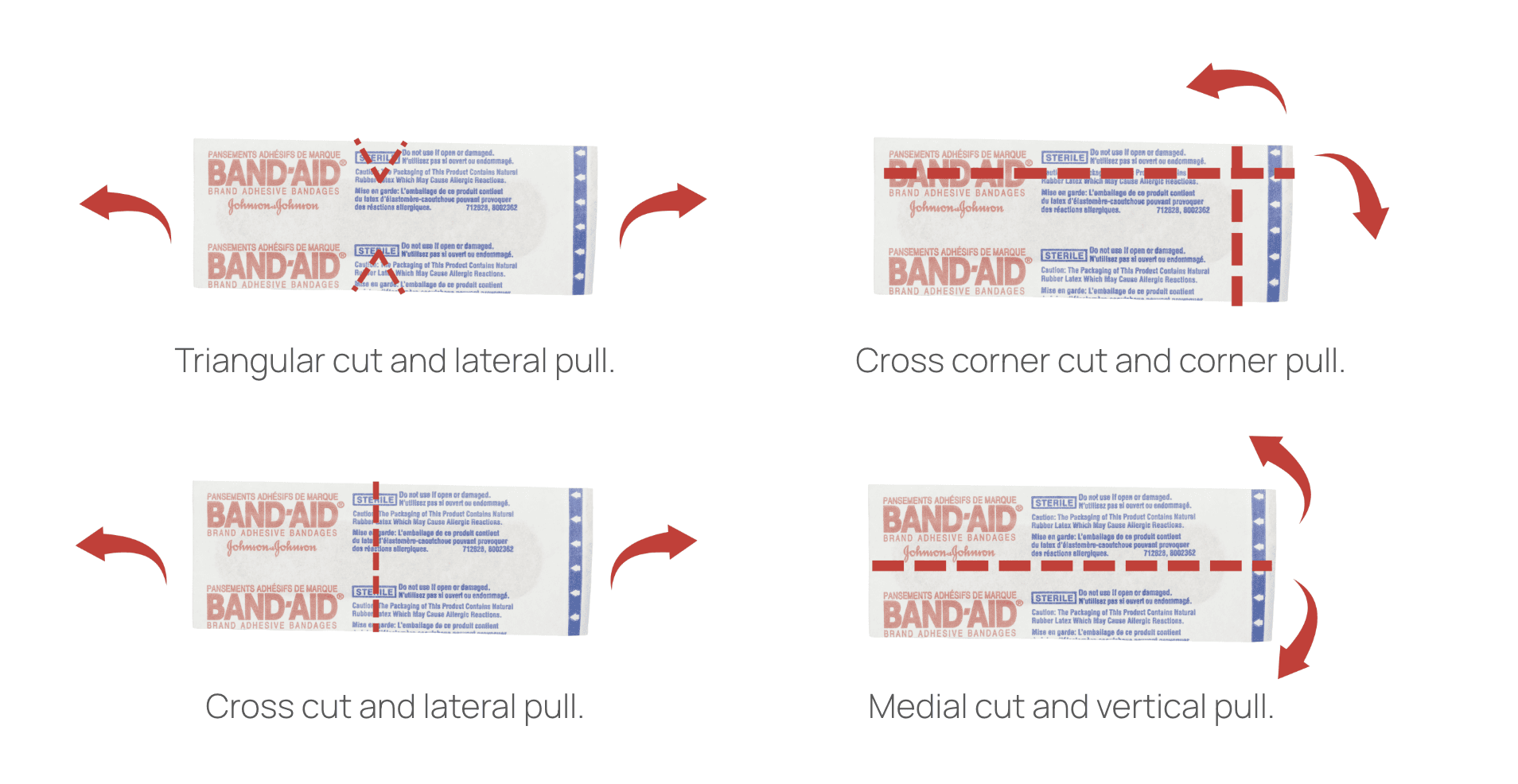 Uses an X-ACTO blade to score the outer wrapper of the band-aid and has a taper at the bottom to snag the wrap.