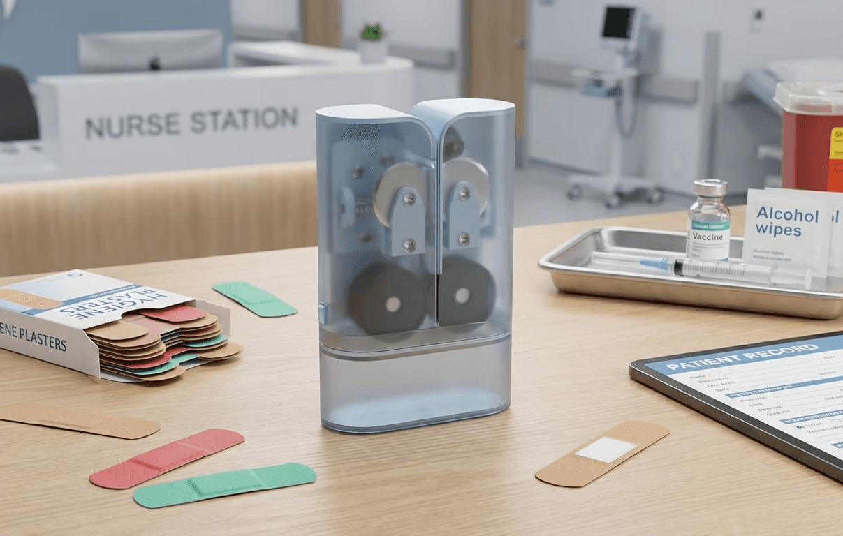 Cut-N-Cure is a mechanical dispensing system designed to automatically remove external packaging and present a standard-sized bandage for immediate application. The device streamlines the "prep-to-apply" workflow, enabling seamless, one-handed operation.
