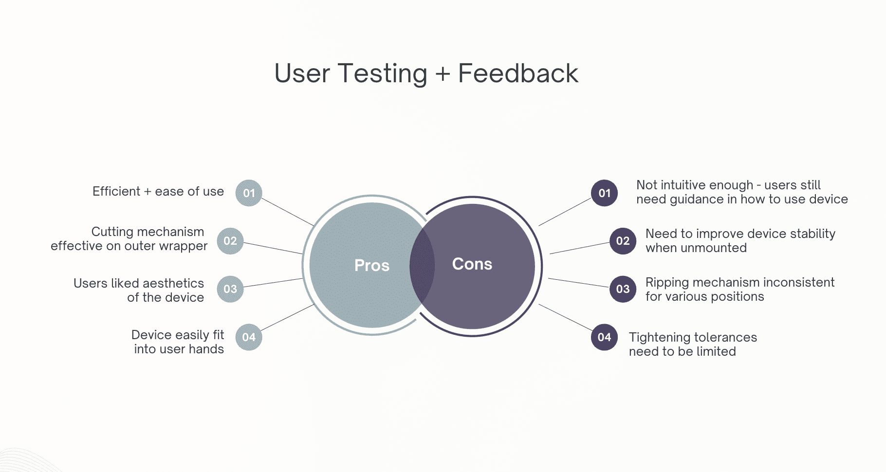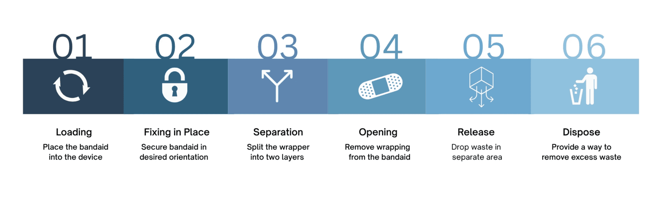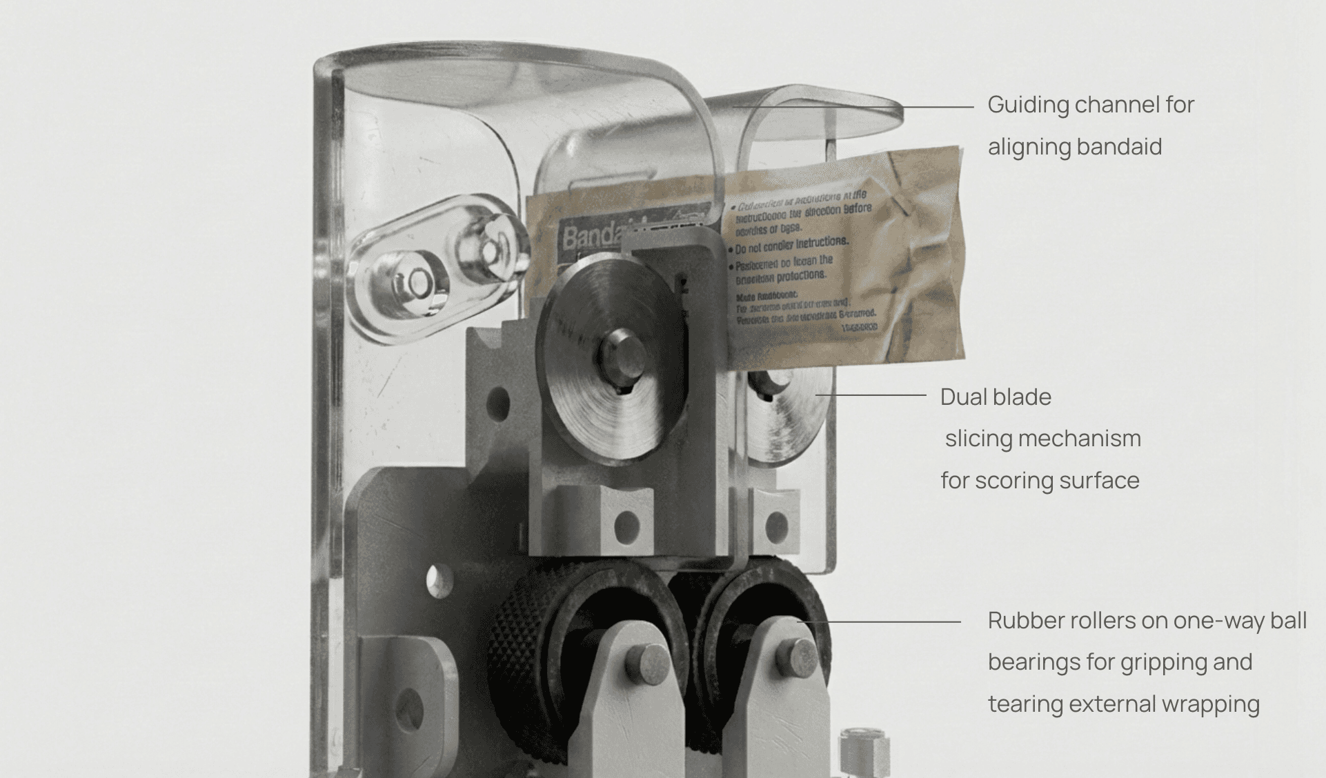 The device was tested with 20+ users which were blindly asked to use the device for the first time. When handed the band-aid, individuals would slide the band-aid into downwards into the slot and the cut would be made. However, variety occurred when removing the wrapping as some would snag the wrap correctly with the wheels while others needed guidance on where to pull. For future iterations, we will aim to improve on these affordances.