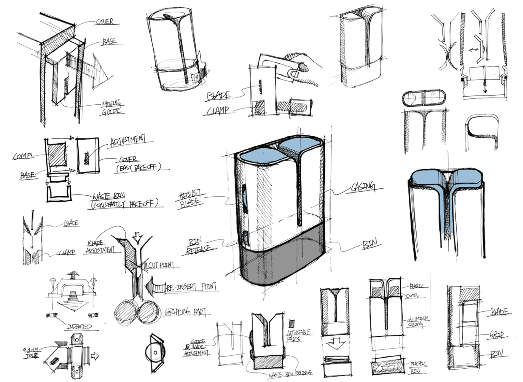Initial concept sketches for prototype with internal and external components. The combined scoring and grip mechanism is shown below to explain the path of the bandaid as it enters the device.